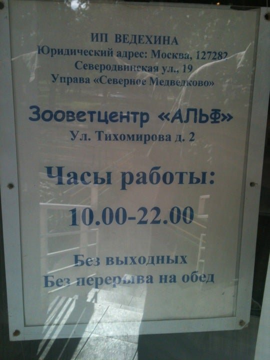 Начиная со входа в «клинику»-грязь! Коврик при входе в залежах пыли, шерсти и грязи. В кабинете (были только в том, где проходит стрижка/мытьё и тд)-антисанитария жуткая. Все столики в пятнах 100 летней давности, приборы в пыли, разводах и грязи. Никаких пелёнок на столики естественно не кладут и не дезинфицируют , ну и что, что каждое животное разное , привитое / нет и тд, администрацию клиники это не смущает. Дезинфекции никакой. Специалист о перчатках вообще не слышала. Расчески, щётки в году 2001 как купили, так и не меняли. Была бы тут возможность прикреплять видео, прикрепила бы, чтобы потенциальные клиенты увидели всё сами. Не переведи Боже пойти к ним! Если вы уважаете себя , своего питомца - обходите эту конторку стороной. В Москве есть масса достойных клиник, КЛИЕНТООРИЕНТИРОВАННЫХ! Где вам помогут, подскажут, сделают всё качественно, угостят кофе и улыбнуться. В этой клинике не понимают , что они оказывают сервис , что раз они назвались вет клиникой , то должны соответствовать стандартам, хотя бы ПРОВОДИТЬ УБОРКУ! Такое наплевательское отношение вижу впервые. Искренне не советую вам это заведение , даже для того, чтобы подстричь питомцу когти. Сравнив чистоту кабинетов в других клиниках, вы поймёте, что «альф»-это просто ужас. А сравнивать есть с чем.